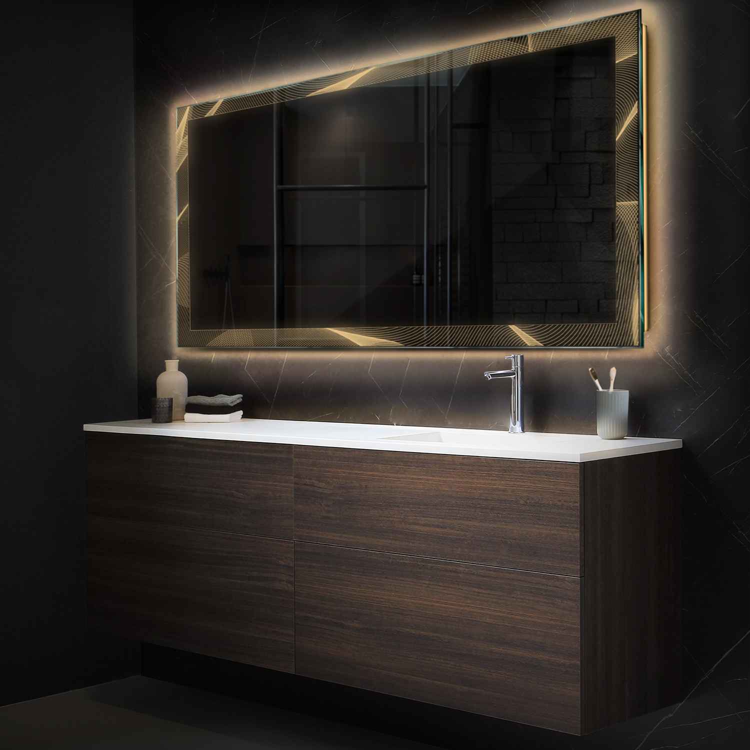 Ambient mirrors: Ambient, Minimal, Edge, Simetria, Good Vibes, Official, and Motivated – decorative backlighting with engraved designs, not intended for grooming.