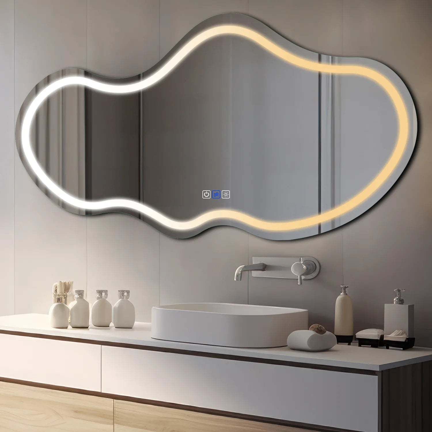 If you choose a model without touch buttons, the mirror will only include the LED strip and will connect directly to your power source. In this case, it is operated via your bathroom wall switch.